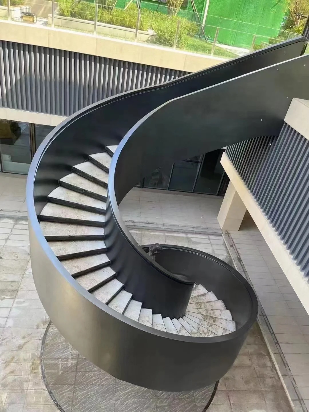 1:Unique Structure and Form:Exterior luxury helical stairs typically feature a helical or curved design that saves space while adding a dynamic flow to the building. Their smooth lines and graceful curves make them the visual centerpiece of a room.